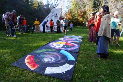 Martin Millen is a First Nation Traditional Healer and Lodge Conductor. Martin come to Frog Hollow in 2023 in a collaborative initiative with Earth Dance Studio and Whirling Wisdom Studio for manifesting of the four sacred canvasses that present “Reconnecting to Nature Through Spiritual Teachings and Sacred Geometry of the Sweat Lodge”.The four 5’x5’ acrylic paintings are titled: “The Earth World”, “The Human World”, The Spirit World”, and “The Sky World”. These paintings, otherwise known as “sacred hoops”, are as a teaching tool to share Ojibway oral knowledge of the four races coming together at the sacred fire. We recognize this being the “8th Fire”. Each of the four races were given two gifts each. As humanity has reached a crossroad, we are asked to bring these eight gifts together to create One Great Nation. The gift of the Red Nation is to carry the Earth and Spirit knowledge. It is through the Sweat Lodge that the Red Standing People communicate this understanding. Martin is utilizing these paintings to communicate sacred knowledge, to develop cross-cultural relationships and to reconnect all people back to good relations with the Earth.